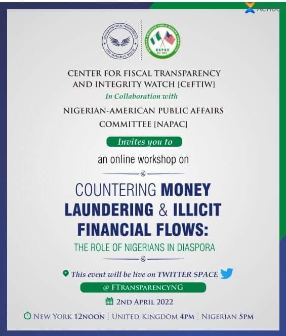 Countering Money Laundering and Illicit Financial Flows: The Roles of Nigerians in Diaspora By adminMarch 3, 2022October 13, 2022Twitter Spaces Join us tomorrow as we partner NAPAC to discuss the roles of Nigerians in diaspora in countering money laundering and illicit financial flows.Join here
